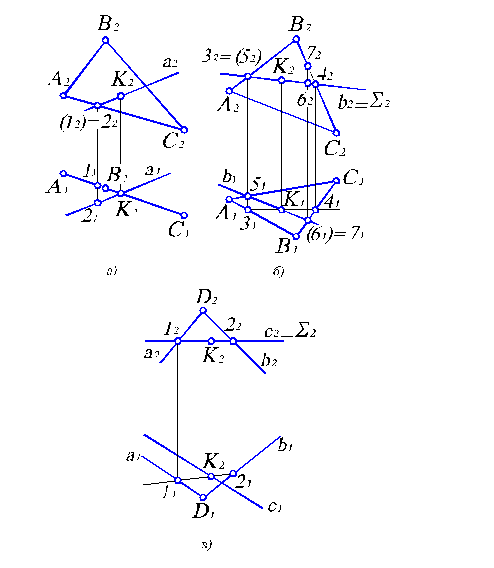 Пусть плоскость занимает частное положение в пространстве, например, является горизонтально-проецирующей и задана треугольником АВС (рис. 2.12, а). Необходимо найти точку пересечения ее с прямой а, заданной произвольно. Поскольку на П 1 горизонтально–проецирующая плоскость вырождается в прямую S1, то горизонтальной проекцией точки пересечения будет К 1. Далее по линии связи на прямой а 2 (очевидно точка пересечения К принадлежит прямой а) найдем фронтальную проекцию К 2 точки пересечения.