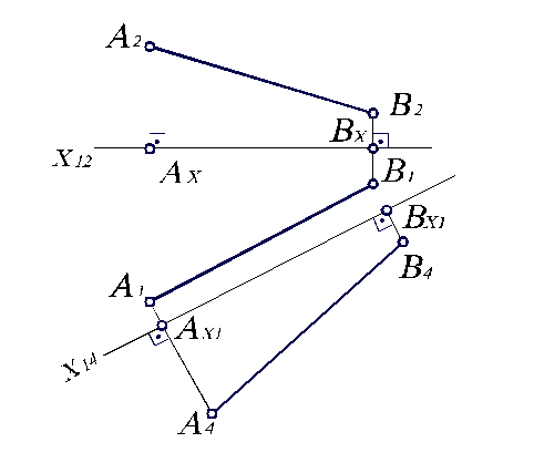 Соединяя найденные точки А 4, В 4, получаем новую проекцию А 4 В 4 отрезка АВ. Как видим, отрезок АВ в новой системе плоскостей проекций П 1/ П 4 является линией уровня, так как А 1 В 1 параллельна X 14, а следовательно, АВ параллельна П 4. Тогда, очевидно, что А 4 В 4 является натуральной величиной отрезка АВ.