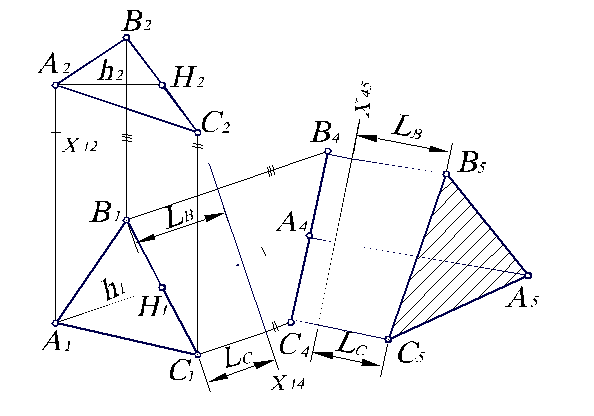 Второй заменой вводим вместо П1 плоскость П5, параллельную плоскости треугольника АВС. Тогда получается система плоскостей проекций П4/П5, ось Х 45 которой параллельна В 4 А 4 С 4. Она может быть расположена на произвольном расстоянии от В 4 А 4 С 4. Далее из точек В 4 А 4 С 4 проводим линии связи перпендикулярно Х 45, и на каждой из них от оси Х 45 откладываем отрезок, равный расстоянию от горизонтальной проекции соответствующей точки до оси Х 14. Получим точки А 5, В 5, С 5, соединив которые имеем треугольник А 5 В 5 С 5, который и является натуральной величиной треугольника АВС, поскольку в новой системе плоскостей проекций треугольник АВС параллелен плоскости П5.