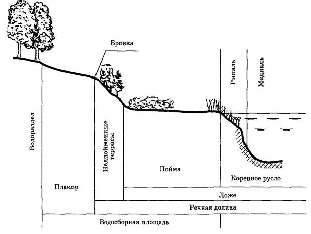 Углубление ложа, заполненное водой в меженный период, называется коренным руслом, или руслом. Часть дна ложа, скрытая под водой во время паводков, называется пойменным руслом, или поймой. В период межени пойменное русло пересыхает и находится выше уровня воды, называясь пойменной террасой. Надпойменная терраса – остатки геологических пород речных русел в далеком прошлом. Бровкой речной долины называется часть суши, совпадающая с верхней частью надпойменной террасы и выровненной водораздельной территорией (плакор).