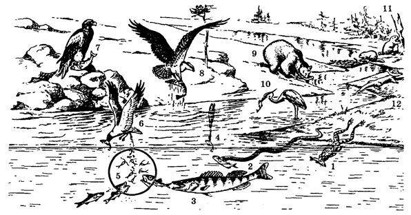 1– лягушка, схватившая рыбу; 2 – уж с пойманной рыбой; 3 – охота судака; 4 – крохаль ныряет за добычей; 5 – рыбы охотятся за циклопами; 6 – чайка, поймавшая рыбу; 7 – орлан с пойманной рыбой;