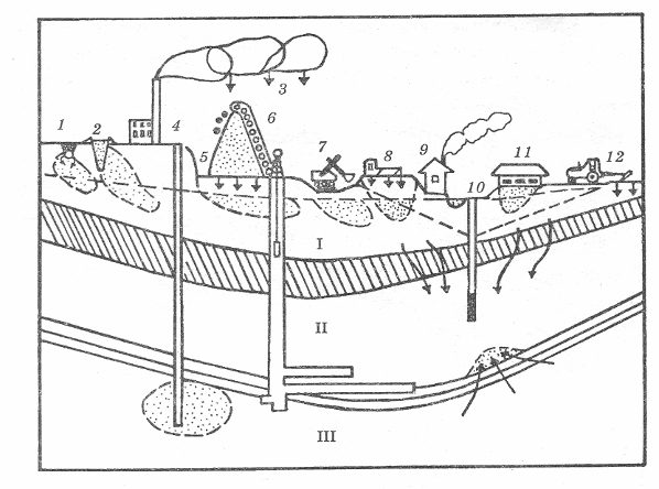 I – грунтовые воды, II – напорные пресные воды, III – напорные соленые воды, 1– трубопроводы, 2 – места хранения отходов обогащения полезных ископаемых, 3 – дымовые и газовые выбросы, 4 -–подземные захоронения промстоков, 5 – шахтные воды, 6 – терриконы, 7 – карьерные воды, 8 – заправочные станции, 9 – бытовое загpязнение,10– водозабор, подтягивающий соленые воды, 11– объекты животноводства,12 – внесение удобрений и пестицидов.