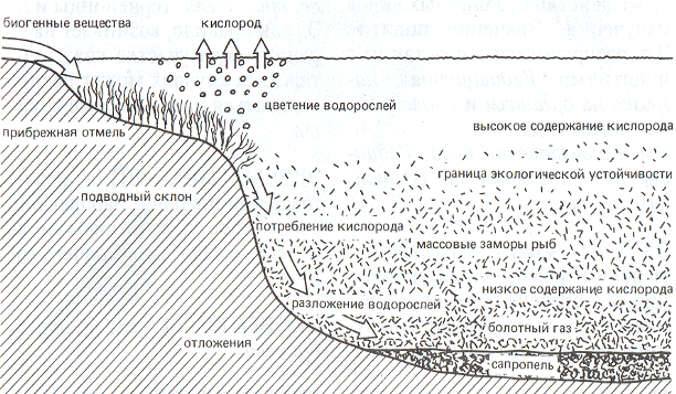 Следствием чрезмерного антропогенного насыщения воды биогенными веществами является массовый рост водорослей, на разложение которых после их отмирания расходуется большое количество кислорода. Кроме этого, в массе развиваются синезеленые водоросли, вызывающие «цветение» воды, ухудшающие ее качество, условия жизни гидробионтов и выделяющие опасные не только для гидробионтов, но и для человека токсины. Также в водоеме происходит перестройка структуры трофических связей, возрастание массы фитопланктона, уменьшение разнообразия видов, что приводит к снижению способности экосистем к гомеостазу и саморегуляции [6, 10]. Нередки заморные явления (рисунок 7.3).