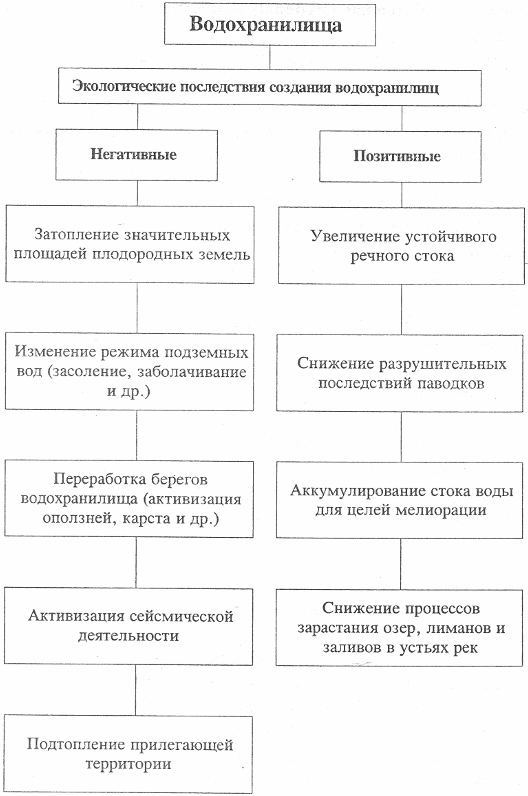Как видно из рисунка, негативных последствий больше и они масштабнее. Кроме того, необходимо учитывать, что при создании водохранилищ путем перегораживания русла рек плотинами значительно изменяются условия существования большинства гидробионтов – многие нерестилища рыб оказываются отрезанными плотинами, ухудшается или прекращается естественное воспроизводство многих проходных рыб.