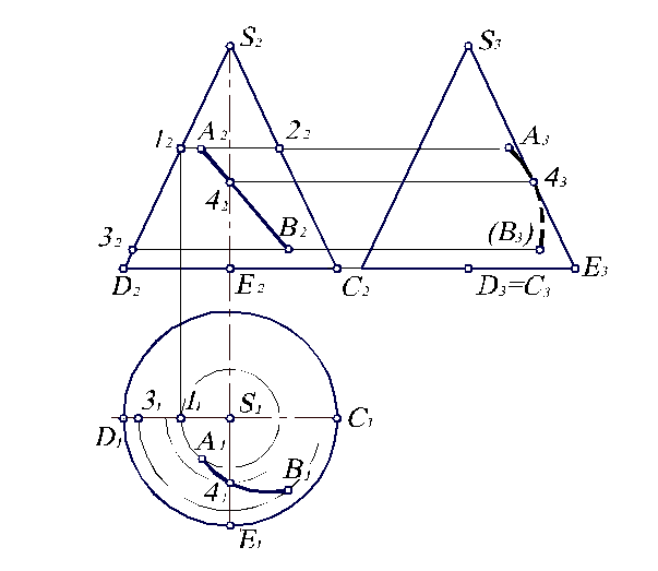 Для построения профильной проекции А 3 В 3 необходимо найти положение контурной точки 4, лежащей на SA. По фронтальной проекции 42, лежащей на S 2 A 2, находим профильную проекцию 43, лежащую на S 3 A 3. Теперь точки А 3, 43, В 3 можно соединить линией.