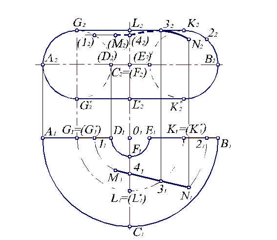 Для этого необходимо через точки М 1 и N 1 провести дуги окружности радиуса О 1 М 1 и О 1 N 1 соответственно до пересечения с прямой А 1 В 1, где получим точки 11 и 21. По линиям связи построим точки 12 и 22, лежащие на окружностях, образующих поверхность тора. Через них проведем горизонтальные прямые, соответствующие дугам окружности на П 1. Следовательно, на них лежат точки М 2 и N 2. Так как контуром видимости является линия GLK, то точка M 2 – невидимая, а N 2 – видимая.
