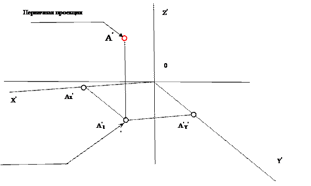 Для построения объекта в аксонометрии необходимо сначала построить его проекционный чертеж, а затем используется способ координат. В этом случае аксонометрические проекции объекта строятся по координатам отдельных точек, взятым с ортогонального чертежа. Построение, как правило, начинается с построения вторичной проекций точек. В качестве вторичной проекции чаще всего используем горизонтальную проекцию точки. Затем из горизонтальной вторичной проекции проводим прямую, параллельную оси Z (строго вертикальную прямую). На ней откладываем координату Z точки и получаем первичную проекцию, т.е.ее аксонометрическую изображение(рис. 5.5).