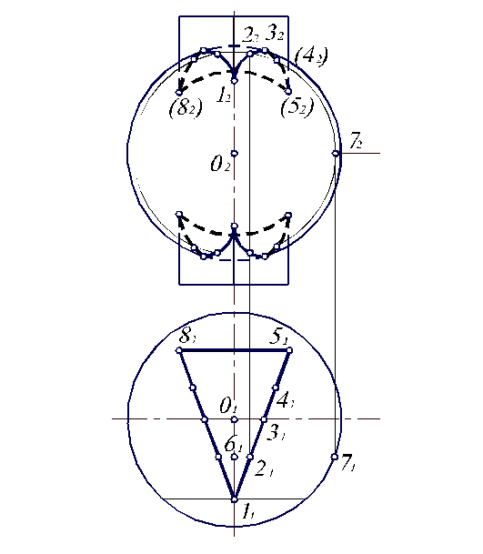 В связи с тем, что рассматриваемые поверхности симметричны относительно горизонтальной и профильной плоскостей уровня, искомая линия пересечения в проекции на П 2 симметрична относительно вертикальной и горизонтальной осей, и ее построение не требует дополнительных пояснений.