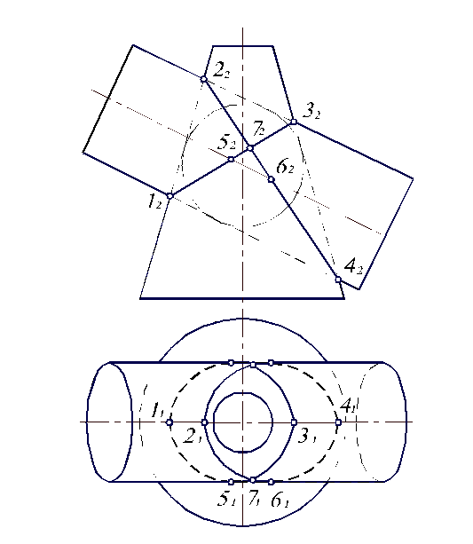 Точки 1, 2, 3, 4 лежат на образующей конуса, параллельной П 2, поэтому их положение на П 1 можно найти по линии связи, проходящей через 12, 22, 32, 42. Точки 5 и 6 выбраны на образующей цилиндра, также параллельной П 2, что позволяет по фронтальным проекциям 52 и 62 найти горизонтальные проекции 51 и 61 соответственно, которые являются точками перехода видимой части горизонтальной проекции линий пересечения цилиндра и конуса в невидимую.