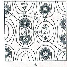 При изучении поликристаллических материалов образец освещается монохроматическим излучением. В множестве произвольно ориентированных кристаллов всегда найдется такой, ориентировка которого отвечает уравнению Вульфа-Брэгга. Отраженный луч регистрируется фотоспособом (рис.2) либо ионизационными или сцинтилляционными счетчиками, сигнал через систему усилителей и пересчетных устройств подается на потенциометр, записывающий кривую распределения интенсивности (рис.3). По расположению дифракционных максимумов судят о геометрии решетки, а по их интенсивности — о распределении электронной плотности, т. е. о вероятности нахождения электронов в той или иной точке кристалла (рис. 4). Распределение электронной плотности дает возможность определять не только положение атомов в решетке, но и тип химической связи. Высокотемпературные приставки к дифрактометрам позволяют регистрировать полиморфные превращения при нагревании, следить за твердофазовыми реакциями.