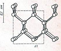 Рис. 4. Распределение электронной плотности (о) и структура (б) кристалла с ковалентной связью (алмаз)