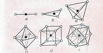 A –гантель (КЧ - 2); б – треугольник (КЧ -3); в – тетраэдр (КЧ - 4);