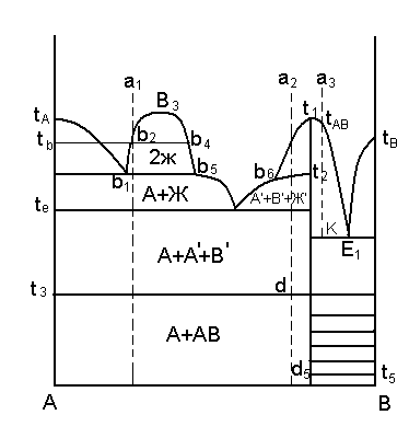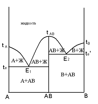 In figure the diagram of a condition двухкомпонентной of system with individual chemical connection АВ плавящимся without decomposition (конгруэнтно) is given. According to a rule of definition of final phases кристаллизации all structures laying to the left from a vertical tАВ - АВ comes to an end to crystallize Е1, and laying in the right in a point Е2. As the connection АВ is individual chemical connection structure precisely adequate(precisely answering) to this connection completely закристаллизуется or расплавиться at constant tАВ.