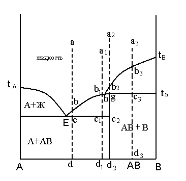 In figure the diagram of a condition двухкомпонентной of system with chemical connection АВ плавящимся with decomposition (инконгруэнтно) is given. A characteristic point of this diagram is the invariant point n (point перитектики). Let's consider ways кристаллизации some расплавов in this system. Structure а1. At cooling structure а1 on a site а1 в1 there is a downturn of his(its) temperature. At temperature to the appropriate point в1 on a curve ликвидуса begins кристаллизация of a component In, and the structure of a liquid phase will change till a curve ликвидуса в1 n at simultaneous кристаллизации In. In a point перитектики n at constant tn there is перитектическая a reaction: as a result of which is allocated АВ. For the given initial structure расплава кристаллизация in a point перитектики will be finished can not, as final phases кристаллизации а1 is the connection And and АВ. The vertical of structure а1 d1 gets between points of structure of connections And and АВ, and the component And in products кристаллизации at перитектической to temperature is absent. Therefore in result перитектической of reaction a component In completely disappears, and the liquid remains. In the further structure of a liquid phase changes till a curve ликвидус Е with allocation of crystals АВ and at last in a point Е кристаллизация comes to an end with simultaneous allocation of final phases кристаллизации of crystals And and АВ. Below эвтектической of a point will occur at downturn of temperature only cooling of a mix of crystals And and АВ on a surface of structure с1d1. Thus way of change of a liquid phase at cooling расплава а1 can be represented as follows: а1 - в1 - n - Е