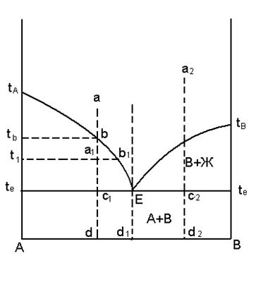 На рисунке представлен тип диаграммы состояния двухкомпонентной системы А-В с эвтектикой (без бинарных химических соединений и твердых растворов). Рассмотрим путь кристаллизации расплава состава а. Конечными фазами кристаллизации любого бинарного состава в этой системе будут компоненты А и В, а кристаллизация будет заканчиваться при эвтектической температуре, то есть в точке эвтектике. При понижении температуры от точки а до в будет происходить только охлаждение расплава, при достижении температуры ликвидуса tB жидкая фаза (расплав)состава В окажется насыщенным по отношению к компоненту А (в области tА , tе - Е) в равновесии с жидкостью находятся кристаллы А. Состав жидкой фазы будет изменяться при этом по кривой ликвидуса от точки в до Е (система моновариантна). В точке Е одновременно выделяются кристаллы А и В, следовательно жидкость состава Е насыщена по отношению к обоим компонентам.