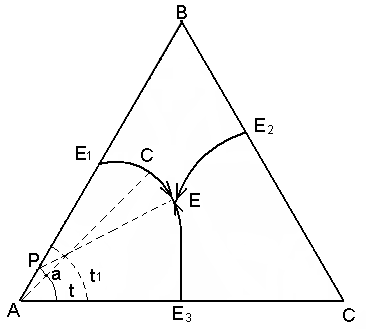 Эта диаграмма без химических соединений с одной тройной эвтектикой. Процесс кристаллизации при охлаждении состава m в точке а будет происходить следующим образом: понижение температуры расплава соответствуют участок Аа, когда температура расплава станет равной температуре первыми начнут выделяться кристаллы вещества А. По мере дальнейшего охлаждения расплава будет обедняться компонентом А и, следовательно, обогащаться компонентами В и С. Состав расплава будет изменяться по линии ас, являющимся продолжением Аа. Линия ас называется путем кристаллизации. При достижении температуры соответствующий точке с, расплав на столько обогатится компонентом С, что этот компонент начнет выделяться в виде эвтектике вместе с веществом А. Путь кристаллизации пойдет по линии двойной эвтектике Е1Е от точки с до тройной эвтектике Е. В точке Е наряду с а и с будет выделяться и третий компонент В до окончательного застывания всего состава кристаллов АС и В при температуре равной tE в точке Е останется постоянной. По окончании процесса кристаллизации застывшая система из кристаллов А, В и С продолжает охлаждаться до температуры окружающего пространства.