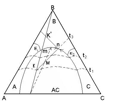 2. Точка состава жидкой фазы находится на пограничной кривой. Путь кристаллизации того же расплава состава М продолжается до температуры t3. При этой температуре в равновесии находится три фазы: жидкое состава точки n, лежащей на пограничной кривой и две твердые фазы – это кристаллы В и АС. Определяется путь кристаллизации от температуры t1 – t3 . Сначала определяется содержание жидкой и всей твердой фаз, суммарное содержание В+АС, а затем содержание В и АС в отдельности: