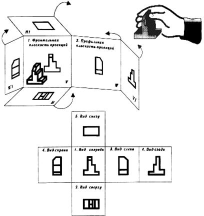 Все изображения изделий проецируются на плоскости проекций, за которые принимают шесть граней куба. Развертка этих граней на плоскости чертежа дает возможность получить шесть проекций предмета (рис. 9.1).