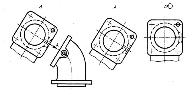 Дополнительным видом называется изображение, полученное на дополнительной плоскости, не параллельной основным плоскостям проекций. Он может быть смещен или повернут относительно главного вида. Этот вид обозначается так же, как было описано выше, и приведен на рис. 9.2.