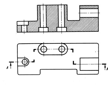 Обозначение секущих плоскостей вводится для простых разрезов, если секущая плоскость проходит не по плоскости симметрии детали, для всех сложных разрезов, для наклонных разрезов. Секущие плоскости, совпадающие с плоскостями симметрии детали при выполнении простых разрезов, допускается не обозначать.