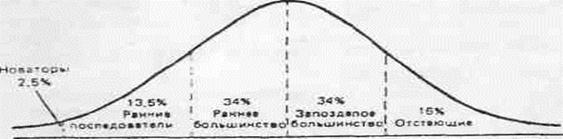Восприимчивость к новому - это «степень сравнительного опережения индивидом остальных членов своей общественной системы в восприятии новых идей». Это позволило классифицировать людей по степени их восприимчивости. После замедленного начала новинку начинает воспринимать все больше людей. Со временем их число достигает пикового значения, а затем процент начинает уменьшаться по мере уменьшения числа еще не воспринявших товар. Новаторами считают первые 2,5% покупателей, к ранним последователям относят следующие 13,5% и т.д. Новаторы склонны к риску. Они опробуют новинки, немного рискуя. Ранние последователи-лидеры мнений в своей среде и воспринимают новые идеи довольно рано, хотя и с осторожностью. Раннее большинство-люди осмотрительные. Они воспринимают новшества раньше среднего жителя, но лидерами бывают редко. Запоздалое большинство настроено скептически. Эти люди воспринимают новинку только после того, как ее уже опробовало большинство. И наконец, отстающие - это люди, связанные традициями. Они с подозрением относятся к переменам, общаются с другими приверженцами традиций и воспринимают новинку потому, что она уже успела в какой-то мере стать традицией.