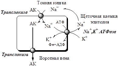 L-аминокислота поступает в энтероцит путём симпорта с ионом Na+. Далее специфическая транслоказа переносит аминокислоту через мембрану в кровь. Обмен ионов натрия между клетками осуществляется путём первично-активного транспорта с помощью Na+, К+-АТФ-азы.