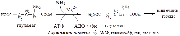 Глутаминсинтетаза находиться в митохондриях клеток, содержит кофактор — ионы Mg2+, является одним из основных регуляторных ферментов обмена АК. Она аллостерически ингибируется АМФ, глюкозо-6ф, гли, ала и гис.