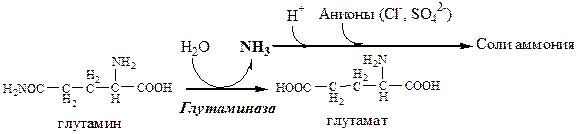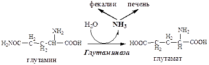 В клетках кишечника также под действием глутаминазы происходит гидролитическое освобождение амидного азота в виде аммиака:
