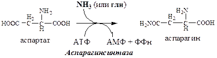 Обезвреживание аммиака в тканях происходит незначительно при синтезе аспарагина под действием глутаминзависимой и аммиакзависимой аспарагинсинтетазы.