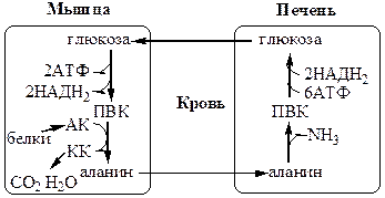 Мышцы выделяют особенно много аланина в силу их большой массы, активного потребления глюкозы при физической работе, а также потому, что часть энергии они получают за счёт распада АК. Образовавшийся аланин поступает в печень, где подвергается непрямому дезаминированию. Выделившийся аммиак идет на синтез мочевины, а ПВК включается в глюконеогенез. Глюкоза из печени поступает в ткани и там, в процессе гликолиза, опять окисляется до ПВК.