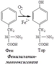 | Превращение фенилаланина в тирозин необратимо катализирует фенилаланингидроксилаза (монооксигеназа), коферментом которой служит тетрагидробиоптерин (Н4БП), кофактором - Fe2+. Н4БП в результате реакции окисляется в дигидробиоптерин (Н2БП). Регенерация последнего происходит при участии дигидроптеридинредуктазы с использованием НАДФH2. Реакция необходима для удаления избытка фенилаланина, так как высокие концентрации его токсичны для клеток. Образование тирозина не имеет большого значения, так как недостатка этой аминокислоты в клетках практически не бывает. |