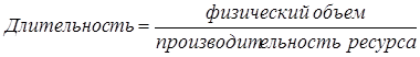 Для таких операций вместо длительности на данном этапе может быть определен объем работ в физических единицах. И это действительно на данном этапе оказывается проще, чем сразу определять длительности операций (например, кладка кирпичной стены 50 м2, а бригады могут класть с разной производительностью). Для таких операций длительность определяется как отношение физического объема операции к производительности ресурса (количество единиц объема выполняемое ресурсом в ед. времени):