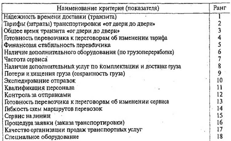 Таблица 5.1 Ранжирование критериев при выборе перевозчика
