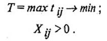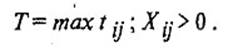 Главным в данной модификации транспортной задачи является выражение времени T через времена tij и перевозки Xij. Так как все перевозки заканчиваются в момент, когда завершается самая длительная из них, то время Т есть максимальное из всех времен tij, отражающих длительность нулевых перевозок: