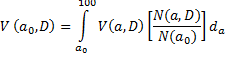 - вероятность дожить до возраста a у лица, оставшегося в живых в возрасте a0 с учетом риска умереть от радиационного рака или любой другой причины.