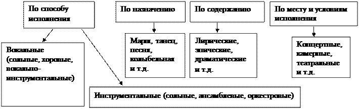 | 5. Жанр | Первичные жанры - песня, танец, марш. Вторичные жанры – опера, симфония, балет, оперетта. |