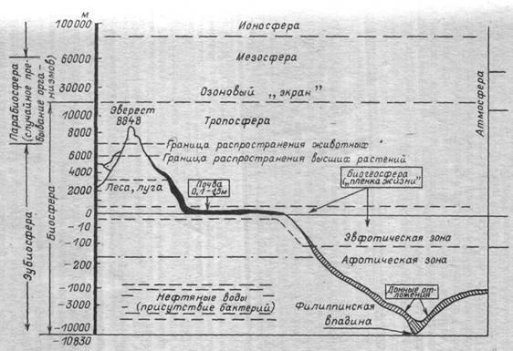 Верхней границей биосферы служит защитный озоновый слой, выше которого УФ излучение исключает существование жизни. Общая протяженность биосферы по вертикали составляет 33-35 км.