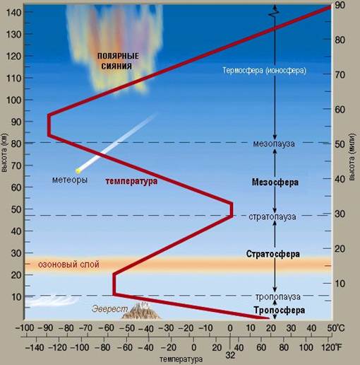 Мезосфера. Количество озона в ней уменьшается, средняя температура там значительно ниже. На высоте 80 км она равна – 70 оС.