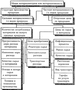 Материалоемкость, так же как и материалоотдача, зависит от объема валовой (товарной) продукции и суммы материальных затрат на ее производство. В свою очередь объем валовой (товарной) продукции в стоимостном выражении (ТП) может измениться за счет количества произведенной продукции (VBП), ее структуры (УДi) и уровня отпускных цен (ЦП). Сумма материальных затрат (МЗ) также зависит от объема произведенной продукции, ее структуры, расхода материалов на единицу продукции (УР) и стоимости материалов (ЦМ). В итоге общая материалоемкость зависит от структуры произведенной продукции, нормы расхода материалов на единицу продукции, цен на материальные ресурсы и отпускных цен на продукцию.