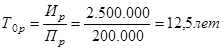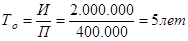 Пример 4.1. Пусть первоначальные инвестиции в проект составляют 2 млн. руб., а прибыль, прогнозируемая к ежегодному получению, - 400 тыс. руб. Тогда срок, или период, окупаемости таких инвестиций составит: