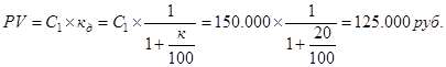 Именно эту сумму надо вложить, с тем, чтобы при ставке в 20% годовых получить через год 150 тыс. руб. Если инвестор захочет продать свой проект, то 125 тыс. руб. - это возможная рыночная цена проекта. Таким образом, отсроченный денежный доход (С1 = 150 тыс. руб.) здесь предстает как приведенная стоимость выручки от реализации (продажи) объекта инвестиций.