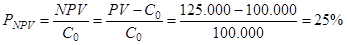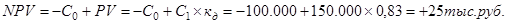 В данном примере чистая приведенная стоимость проекта составит: NPV = + 25 тыс. руб. Т.е. доход, отсроченный к получению в связи с инвестициями в проект, превышает вложения финансовых ресурсов на 25 тыс. руб. Здесь уже отсроченный доход представляет собой форму денежных накоплений инвестора в виде прибыли через один год.