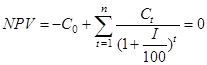 Внутренняя норма доходности определяется как ставка дисконта, при которой чистая приведенная стоимость NPV проекта равна нулю. Это означает, что для определения внутренней нормы доходности инвестиционного проекта продолжительностью t лет необходимо решить уравнение: