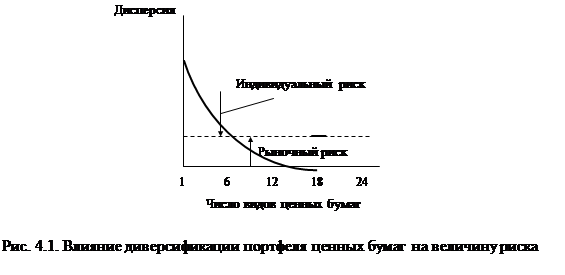 Диверсификация и риск. Для снижения риска портфель ценных бумаг обычно диверсифицируют, т.е. распределяют вложения по разным ценным бумагам. Между диверсификацией и изменчивостью дохода существует обратная зависимость. В основе подобного положения лежит несовпадение изменчивости фондового портфеля в целом со средней изменчивостью доходности отдельных ценных бумаг, составляющих портфель. Влияние диверсификации на снижение риска по мере нарастания числа видов ценных бумаг, формирующих портфель, представлено на рис. 4.1. Стрелка, идущая вниз, указывает на область так называемого индивидуального риска, который прямо зависит от степени диверсификации портфеля. Чем больше число разноименных ценных бумаг в портфеле, тем резче кривая значений риска падает вниз. Область действия рыночного риска, присущего даже хорошо диверсифицированному портфелю, представлена на рисунке стрелкой, направленной вверх. Рыночный риск не устраним никакой диверсификацией, это систематический риск, и в этом его отличие от индивидуального риска, который можно назвать диверсифицируемым, или несистематическим риском.