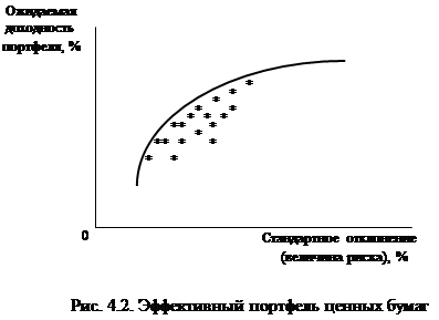 Доходность и риск. Базовые принципы портфельных инвестиций, описывающие взаимосвязь величины риска и доходности ценных бумаг в портфеле инвестора сформулированы в 50-х годах Г. Марковичем. Любой инвестор стремится приобрести на фондовом рынке ценные бумаги с максимальной ожидаемой доходностью и минимальным риском, т.е. по возможности с низким стандартным отклонением. Область рыночного разброса этих показателей и кривая наиболее выгодных условий формирования портфеля показана на рис. 4.2.