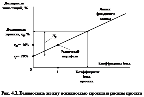 Из рис. 4.3 можно сделать вывод, что ожидаемая премия за риск (Пр)по каждому виду инвестиций прямо пропорциональна его бета-коэффициенту. Это означает, что каждый вид инвестиций должен лежать на наклонной линии фондового рынка, связывающей гарантированную фиксированную доходность и рыночный портфель. В связи с изложенным выше ожидаемая доходность проекта инвестиций может быть представлена формулой: