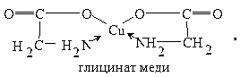 В группу хелатов входят и внутрикомплексные соединения, в которых центральный атом, включаясь в состав цикла, образует ковалентные связи с лигандами разными способами: донорно-акцепторным и за счёт неспаренных атомных электронов. В организме такие комплексы характерны для ионов Cu или Fe с аминокислотами, например, меди с глицином в глицинате меди: