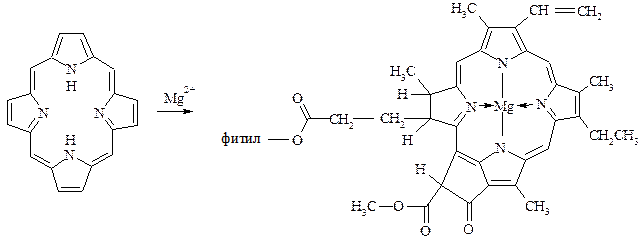 В молекуле порфина два протона, связанные с азотом, легко замещаются на атом металла. Еще две связи, двух оставшихся атомов азота с атомами магния, формируются по донорно-акцепторному механизму.