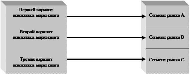 2. С целью обеспечения разнообразия товаров на рынке, предприятие может предложить рынку два или несколько товаров разного качества, оформления, разной расфасовки и упаковки. При этом для каждого сегмента рынка разрабатывается свой товар и используется соответствующий комплекс маркетинга. В таком случае речь идет о товарно-дифференцированном маркетинге (рис. 1.14.).Обычно он применяется с целью более глубокого проникновения на каждый из осваиваемых сегментов рынка и увеличения объема продаж.