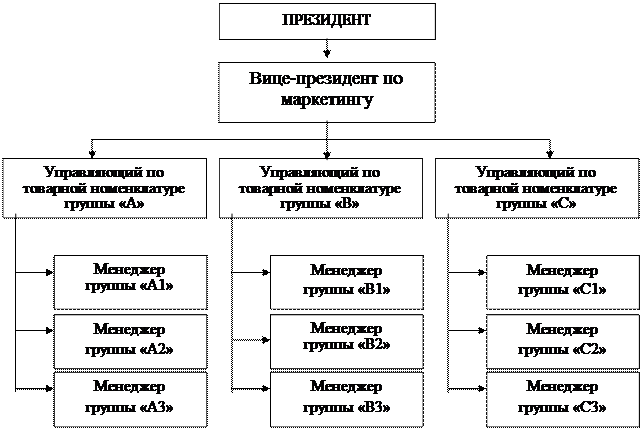 Товарная организация службы маркетинга (рис. 2.2) заключается в том, что по каждому товару (группе товаров) имеется свой управляющий с группой сотрудников, выполняющих все функции маркетинга по данному товару (товарной группе).